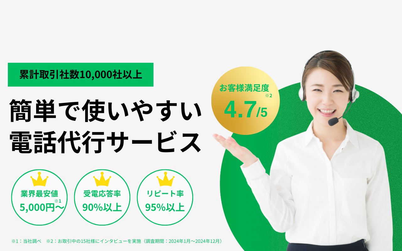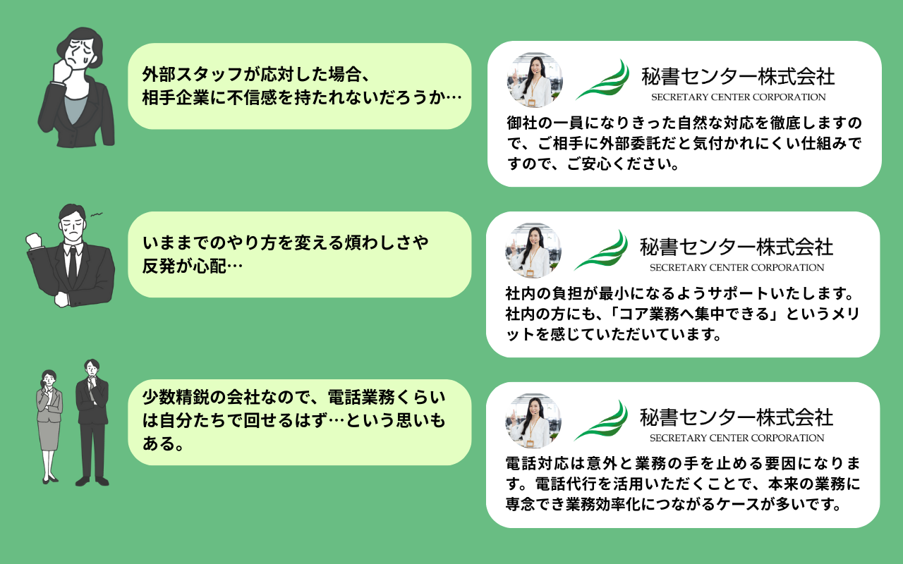 取次ぎ、簡単な問い合わせ対応、不在時の対応まで完全サポート。